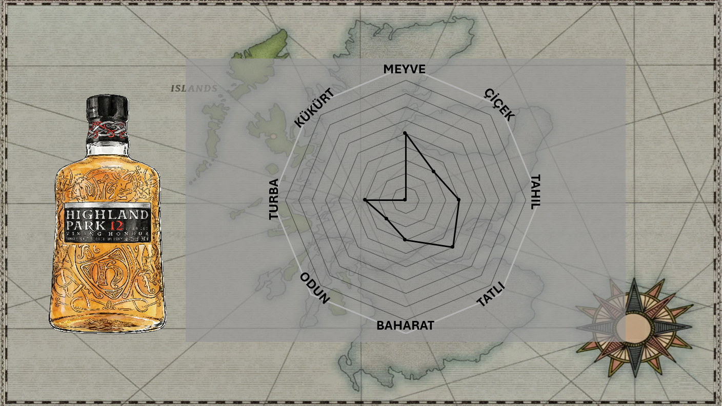 Highland Park Damıtımevi’nin temel şişelerinden olan Highland Park 12 Viking Honour, Orkney adalarının rüzgârlı ve deniz esintili karakterini bal dokunuşlu hafif turbayla birleştiren dengeli bir profil sunuyor. Avrupa ve Amerikan meşe şeri fıçılarında (özellikle first-fill ve refill sherry seasoned cask’lerde) olgunlaşıyor. %40 alkol oranına sahip, soğuk filtrasyon uygulanıyor ve renklendirici (E150a) kullanılıyor. Bu şişe; Islay kadar keskin olmayan ama tamamen turbasız da kalmayan, “orta yol” duman karakteriyle geniş bir kitleye hitap ediyor. Hem şeri etkisi hem de hafif is dokunuşu bir arada.