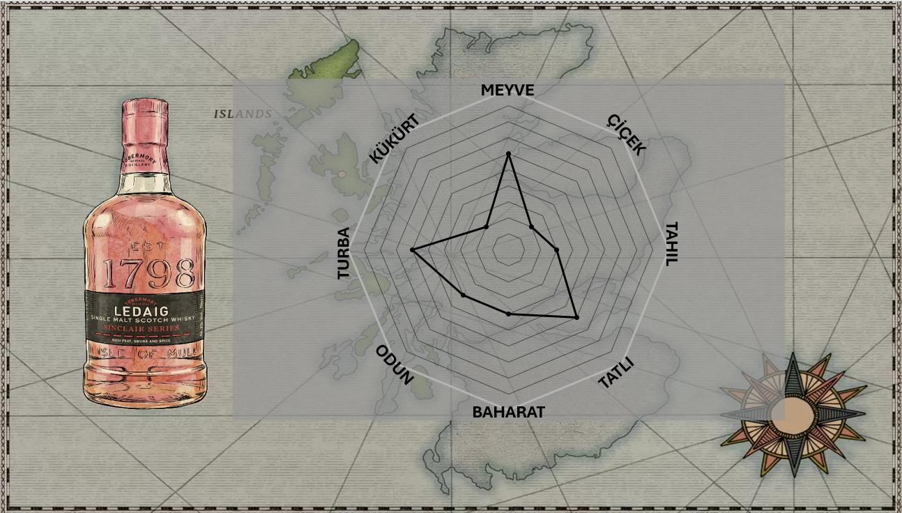 Burun: İlk anda isli malt ve hafif iyot. Arkasından vişne, böğürtlen ve kırmızı erik gibi koyu kırmızı meyveler geliyor. Hafif karabiber ve nemli toprak hissi, adanın vahşi karakterini hatırlatıyor.