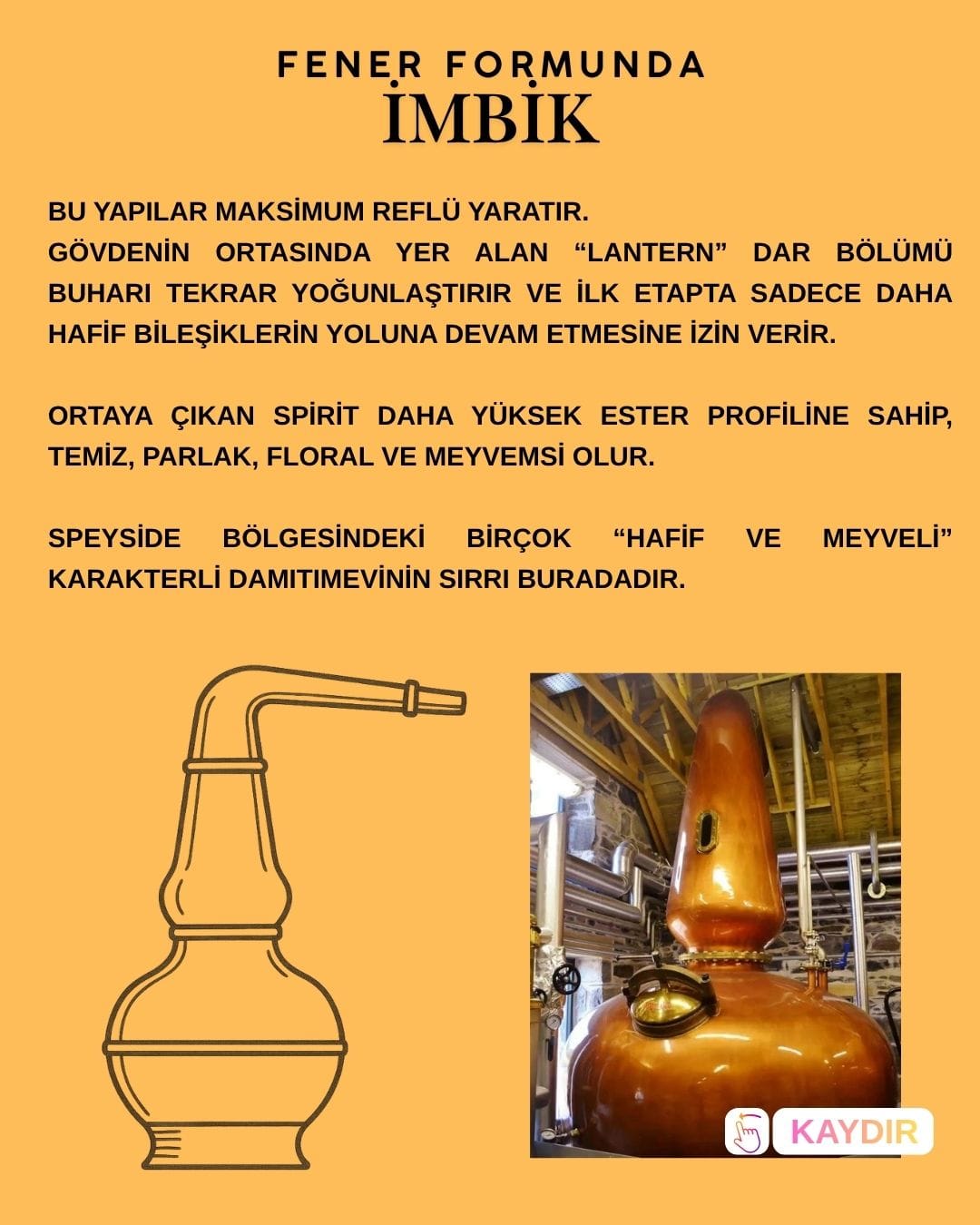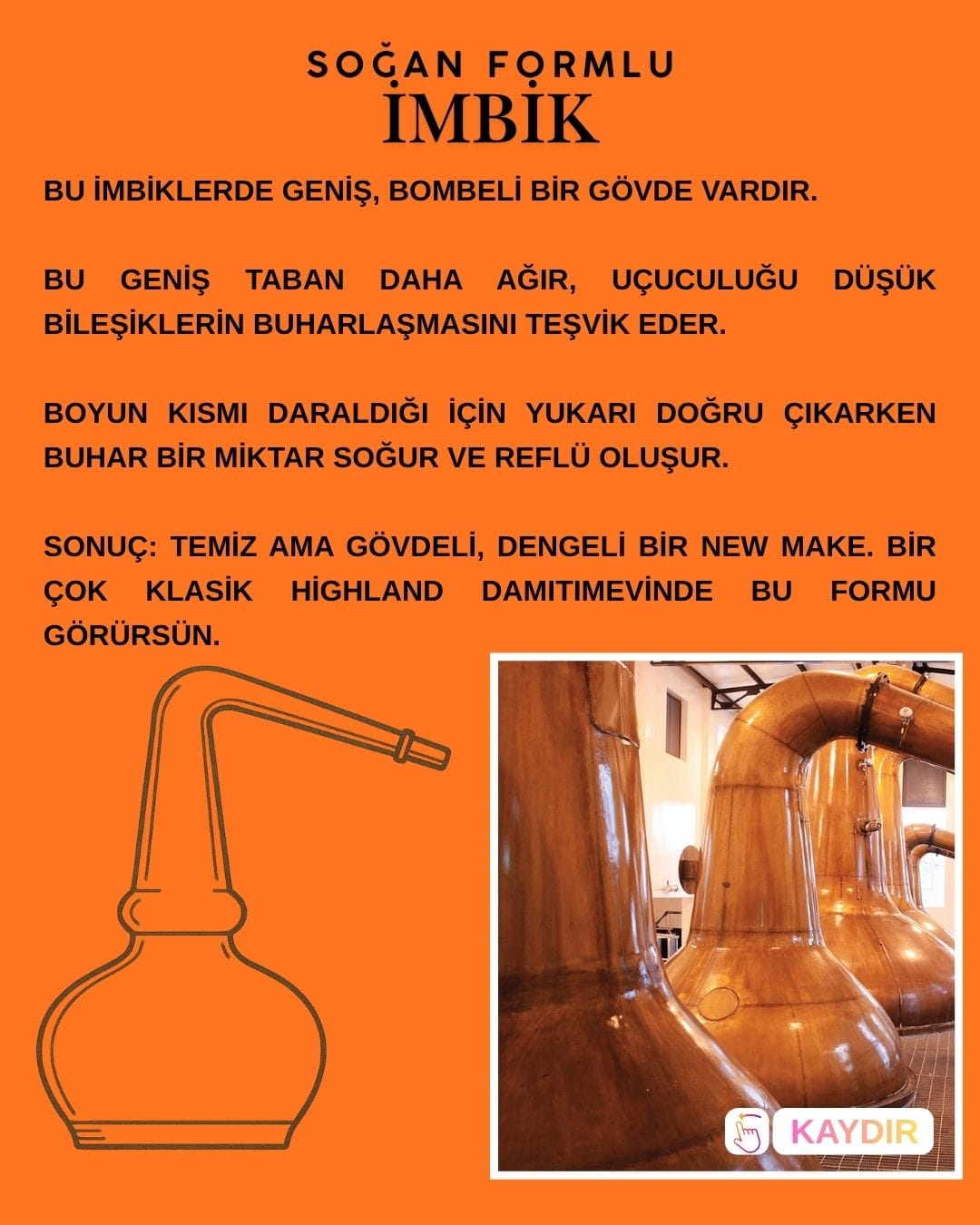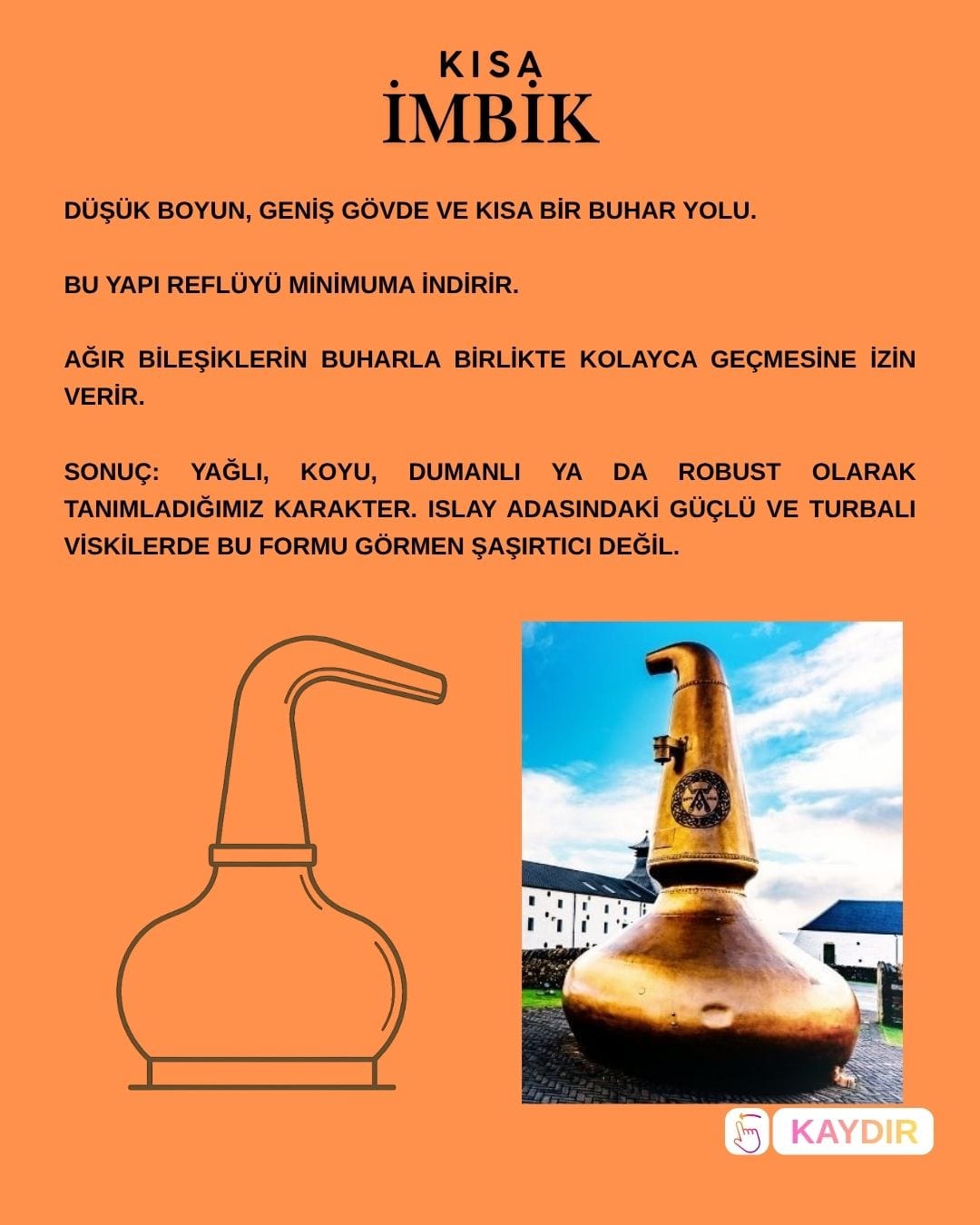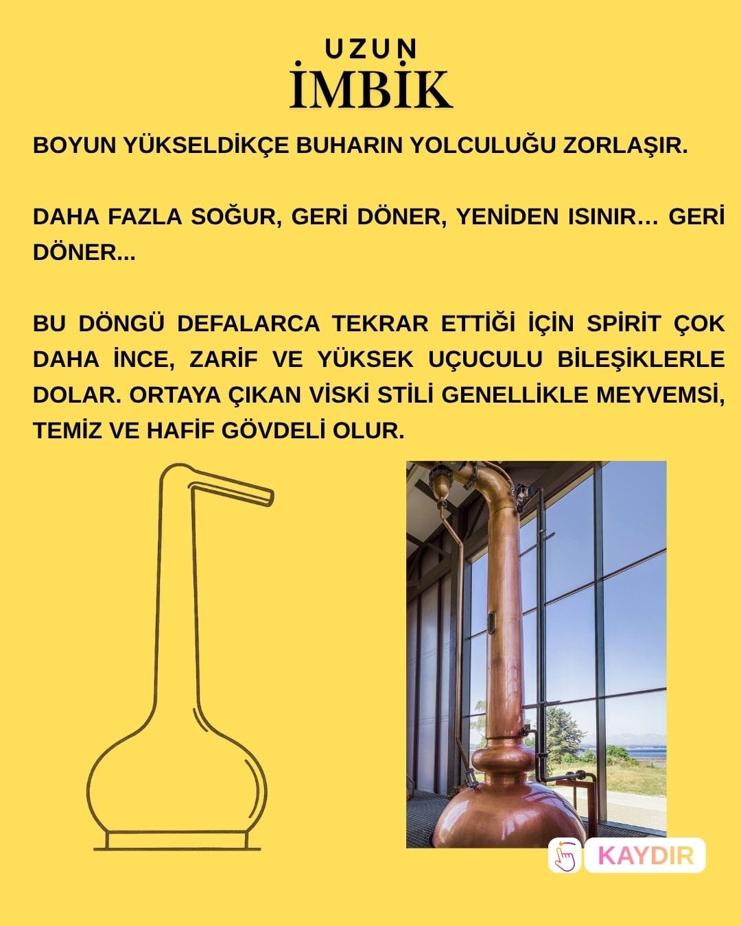 Tahıl malzemeyi belirler, fermanstasyon yön verir fıçı karakteri inşa eder ama damıtım aşamasında kullanılan imbik şekli tüm bu sürecin yönünü belirleyen kritik aşamadır.