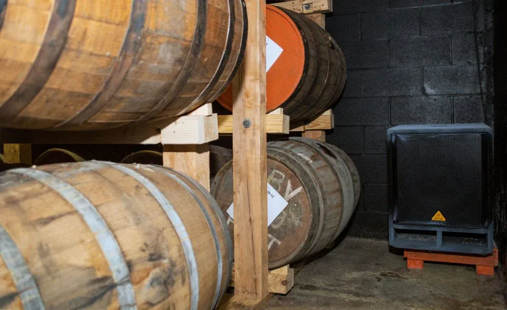 Copper & Kings’in depolarında fıçıların yanına dev subwoofer hoparlörler yerleştiriliyor ve gün boyunca yüksek sesli rock, blues ve caz müzikleri çalınıyor. Amaç, güçlü bas titreşimlerinin fıçı içindeki sıvıyı hareket ettirerek sıvı ile ahşap arasındaki teması artırmak ve aromatik gelişimi hızlandırmak. Şirket, klasik müzik veya yumuşak melodiler yerine özellikle tempolu, ritmik ve enerji dolu parçaları tercih ediyor. Hangi gün hangi şarkıların çalındığına dair bir “playlist” bile tutuyorlar.